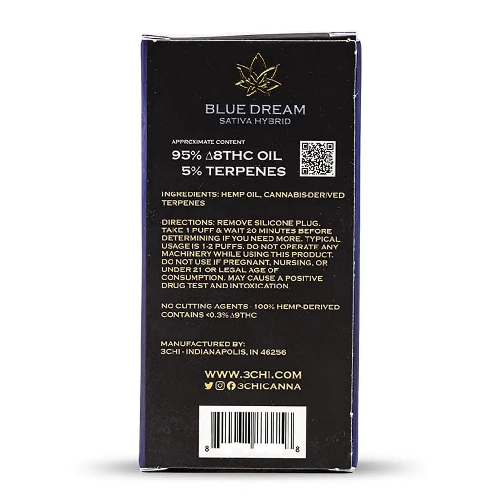 The 3Chi Delta 8 THC Disposable Vape Pen – Blue Dream has an unbeatable uplifting feel and contains 95% Delta 8 THC (Δ8THC) oil. Each 1 ml disposable vape pen contains a tasty blend of Delta 8 THC and Cannabis Derived Terpenes (CDT) that give this disposable vape pen a sweet blueberry flavor. There are no cutting agents, such as VG, PG, PEG, Vitamin E, MCT, or anything else, used in this premium product. This breathe-activated rechargeable vape pen does not require a separate battery.